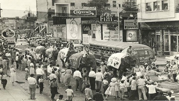 El carnaval perezjimenista de los 50 fue un tanto más burocrático e institucional, más a tono con el estilo de la década; ascético, lineal, impecable y con cara de uniforme militar recién planchado, como lo veíamos relucir en las fachadas y los monumentos emblemáticos del Nuevo Ideal Nacional. El Paseo de Los Próceres, el Círculo Militar; grandes escenarios de los bailes carnavalescos. La prosperidad petrolera parecía traducirse en docilidad y buenos modales. Los inconformes decían que era miedo; pero sea lo que fuere, nadie se salía del carril. El desfile recorría ordenadamente las nuevas avenidas. Los espectadores observaban el paso de las carrozas con respetuoso asombro. Nadie se hubiera atrevido a tocar. Todo era del gobierno.